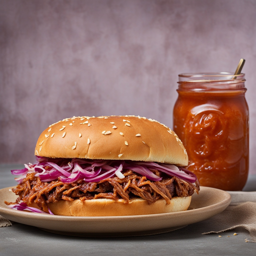 Ein klassisches amerikanisches Gericht mit zartem Pulled Pork, das in BBQ-Sauce ertränkt und auf einem glutenfreien Brötchen serviert wird.
