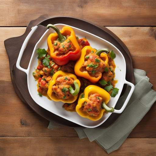 Köstlich gefüllte Paprika mit einer Mischung aus Hähnchenflügeln, Kürbis und einer cremigen Vollmilchsauce, alles getoppt mit einem goldenen Brotmehl- und Eiüberzug.