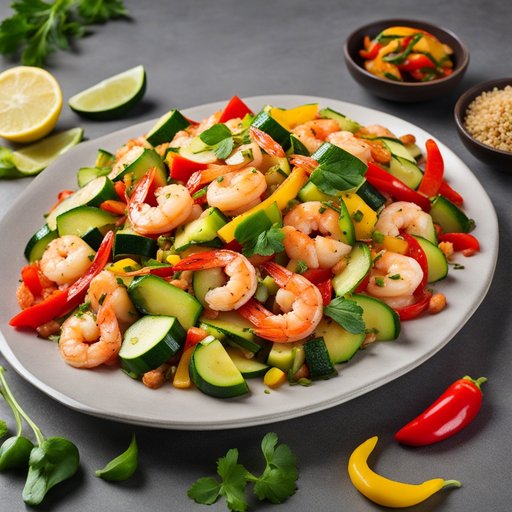 Ein köstliches und geschmackvolles Pfannengericht mit saftigen Garnelen, frischer Zucchini und buntem Paprika.