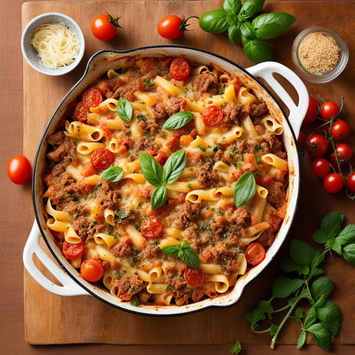 Ein tröstliches und käsiges Nudelgericht mit Rinderhackfleisch, Kirschtomaten und knusprigen Brotkrumen