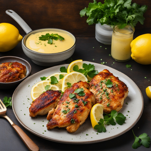 Ein köstliches und einfaches gebratenes Hähnchengericht, serviert mit einer würzigen Zitronenbuttersoße. Perfekt für ein schnelles und geschmackvolles Abendessen!