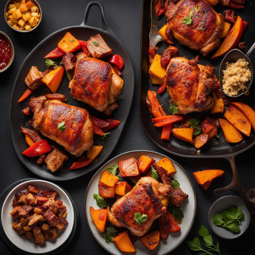 Ein köstliches und herzhaftes Gericht mit saftigen Hähnchenschenkeln, umwickelt mit knusprigem Speck, serviert mit gerösteten Süßkartoffeln und Paprika.