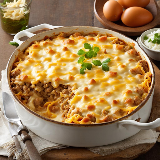 Ein tröstlicher und cremiger Auflauf aus einer Mischung aus Rinderhackfleisch und Hähnchenbrust ohne Knochen, garniert mit einer käseüberzogenen Schicht aus reduziertem fettarmem geriebenem Cheddar-Käse.