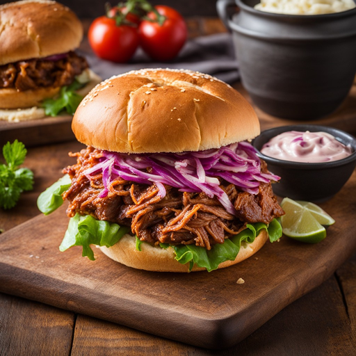 Ein klassisches amerikanisches Gericht mit zartem Pulled Pork, das in würziger BBQ-Sauce ertränkt ist und auf einem weichen Brötchen serviert wird.