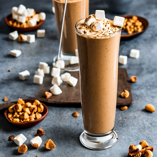 Genießen Sie diesen cremigen und köstlichen Milchshake, der mit Erdnussbutter, Bananen, Schokoladenstücken und Marshmallows zubereitet wird.