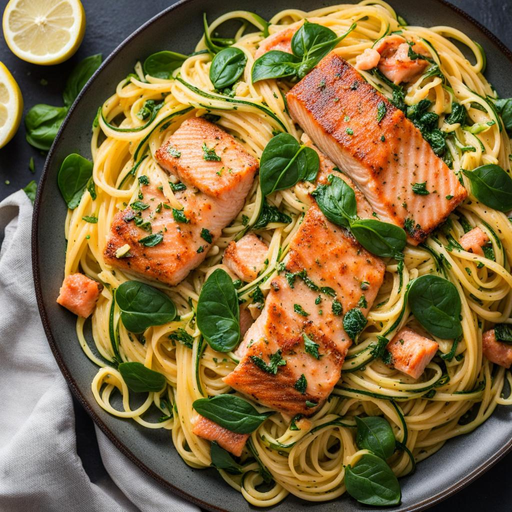 Ein köstliches und nahrhaftes Pastagericht mit Lachs, Spinat und Zucchini in einer würzigen Specksauce.