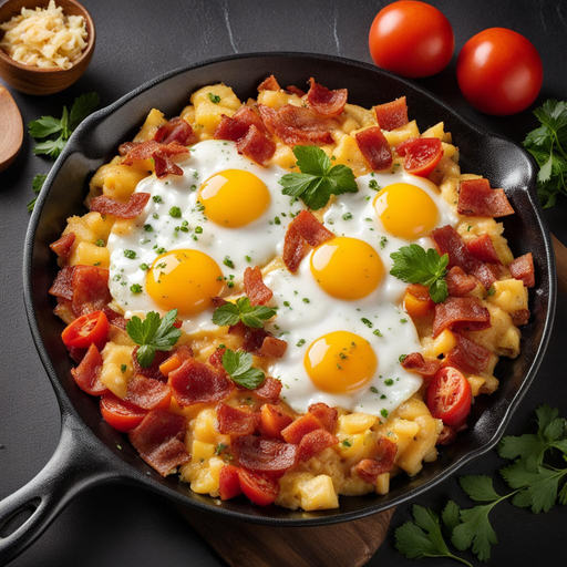 Ein köstliches und herzhaftes Frühstücks-Skillet, gefüllt mit Eiern, knusprigem Speck, gewürfelten Zwiebeln, gewürfelten Tomaten und geschmolzenem Cheddar-Käse.