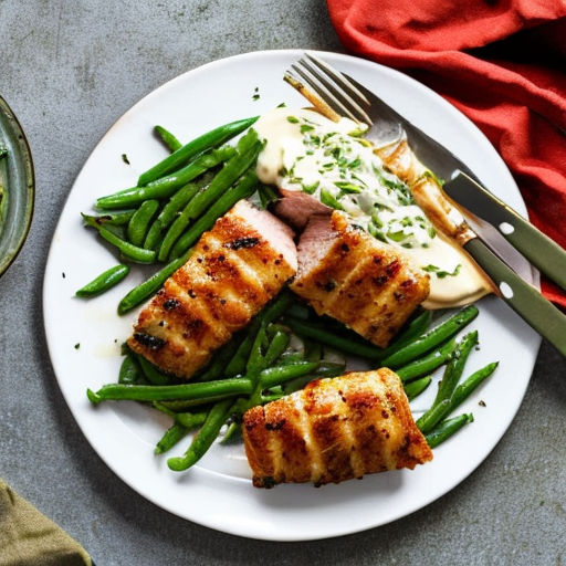 Genießen Sie dieses cremige und geschmackvolle Schweinefiletgericht mit knusprigem Speck und zarten grünen Bohnen.