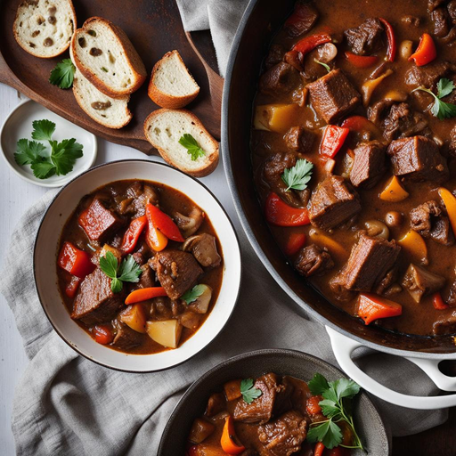1. 1. Die getrockneten Steinpilze in heißem Wasser für 20 Minuten einweichen. 2. In einem großen Topf etwas Öl erhitzen und das Rindfleisch von allen Seiten anbraten. 3. Gehackte Paprikaschoten hinzufügen und kochen, bis sie leicht weich sind. 4. Dosentomaten hinzufügen und mit Kräutergewürz abschmecken. 5. Die eingeweichten Steinpilze abtropfen lassen, hacken und zum Topf hinzufügen. 6. Abdecken und 1-2 Stunden köcheln lassen, bis das Rindfleisch zart ist. 7. Heiß servieren und genießen!