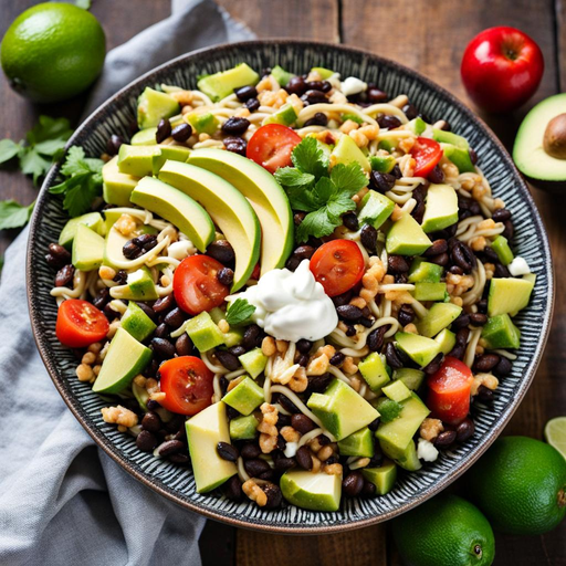 2. 2. In einer großen Schüssel die gekochten Ramennudeln, schwarze Bohnen, gewürfelte Äpfel, in Scheiben geschnittene Avocado und Mozzarellakäse vermengen.