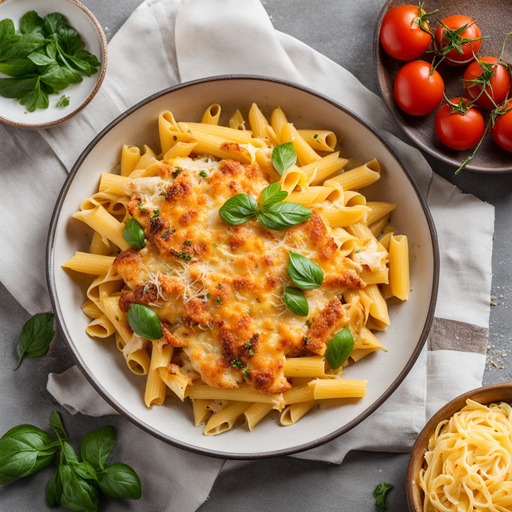 Cremige und aromatische Pastagericht mit zartem Hühnchen und einer käseüberbackenen Kruste