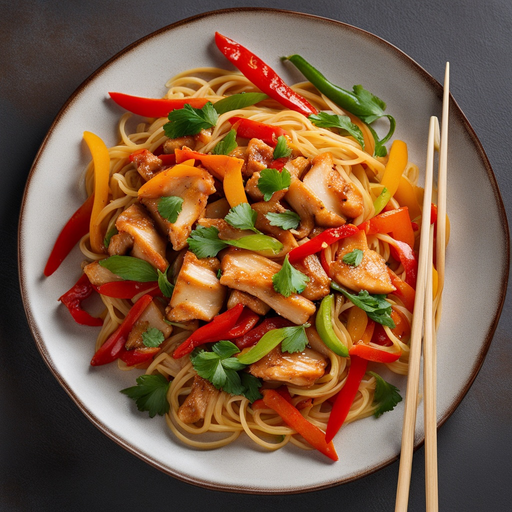 Ein leckeres Pfannengericht mit zartem Hähnchen, bunten Paprikaschoten und herzhafter Würze, serviert über Nudeln.