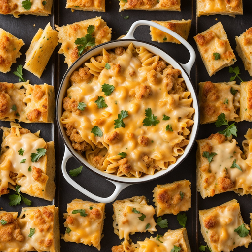 Ein tröstliches und käsiges Nudelauflauf mit Putenhackfleisch, Cheddar-Käse und einer cremigen Sauerrahmsauce.