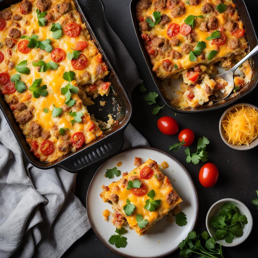 Ein köstlicher und herzhafter Frühstücksauflauf mit Eiern, Schweinswürsten, Cheddar-Käse und aromatischem Gemüse.