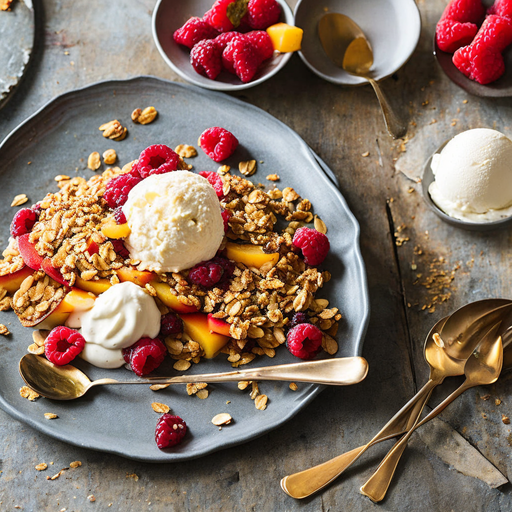 Ein köstliches Dessert, das vor den Aromen von Himbeeren, Pfirsichen und getrockneten Sauerkirschen nur so strotzt und mit einer knusprigen Haferhaube bedeckt ist.