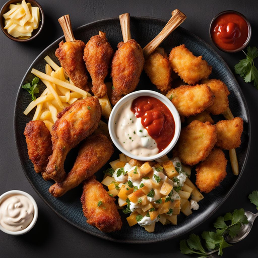 6. 6. Servieren Sie die käsig gebackenen Hähnchenschenkel mit einer Beilage aus Pommes frites, Rösti, Mayonnaise, Ketchup, Ranch-Dressing, leichter saurer Sahne und Frischkäse.