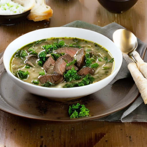 Eine köstliche Suppe mit frischem Koriander, Rib-Eye-Steak, Grünkohl und Pilzen.