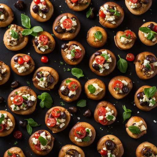 Leckere gefüllte Pilze, gefüllt mit einer aromatischen mediterranen Mischung aus Feta-Käse, frischen Tomaten, Kalamata-Oliven und einem Hauch von trockenem Weißwein.