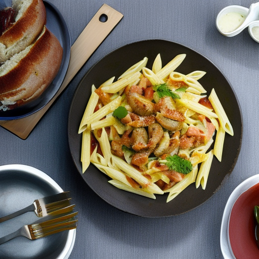 7. Serviere die Penne mit Bratwurst und Curry warm und genieße!