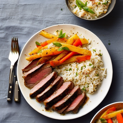 9. Servieren Sie das Roastbeef mit dem gerösteten Gemüse und dem Reis. Genießen Sie Ihr köstliches Hauptgericht!