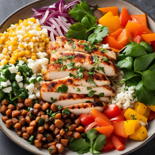 Eine geschmackvolle und nahrhafte Reisschale mit Hähnchenbrustfilet und mediterranen Zutaten