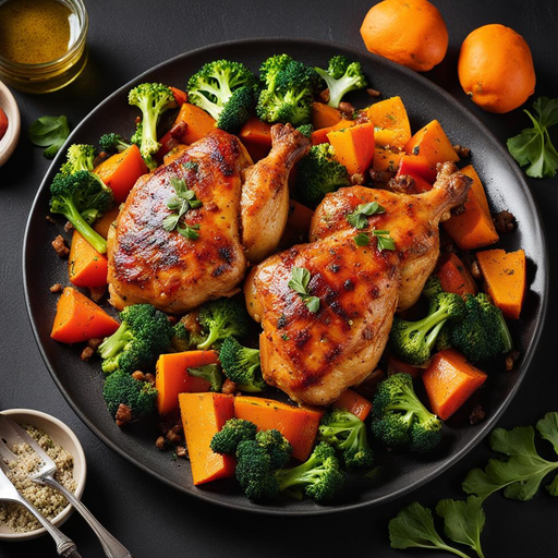 Ein köstliches und einfaches Ein-Pfannen-Gericht mit zarten Hähnchenschenkeln, Süßkartoffeln, Paprika und Brokkoli.