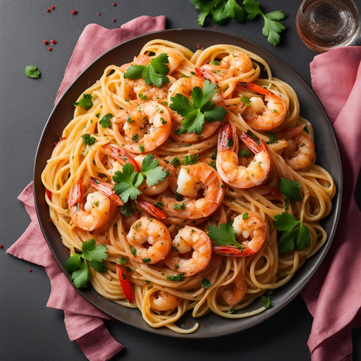 Ein köstliches und geschmackvolles Pastagericht mit einem Hauch von Schärfe und Knoblauch-geschwärzten Garnelen