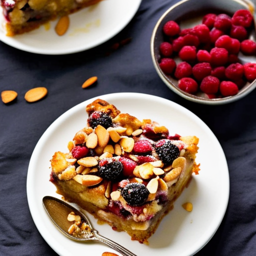 Ein köstliches und gesundes Dessert aus Bananen, Beeren, Brot und gehackten Mandeln.