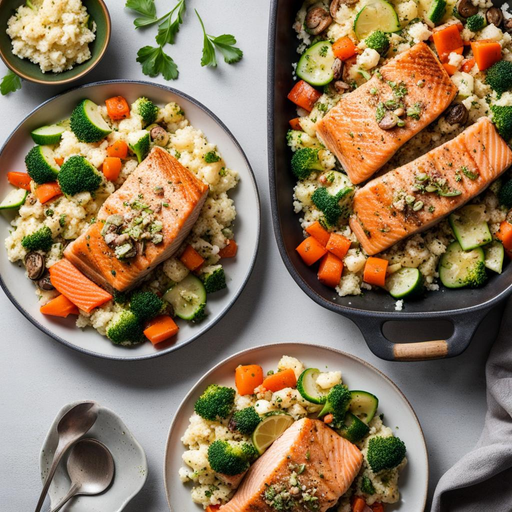 Ein köstliches und gesundes Gericht mit gebackenem Lachs, Blumenkohlreis und Gemüse