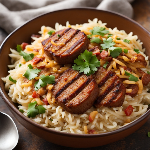 Eine herzhafte und aromatische Reisschale mit Chorizo, Hamburger und einer cremigen Sauce