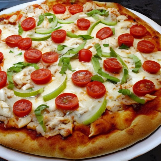 Leckere Hähnchenpizza mit frischen Tomaten und Zwiebeln.