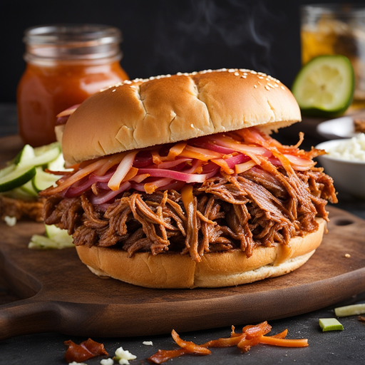 Ein klassisches amerikanisches Gericht, das herzhaft, süß und zufriedenstellend ist. Zartes Pulled Pork, übergossen mit würziger Barbecuesauce, hoch auf einem weichen Brötchen gestapelt.