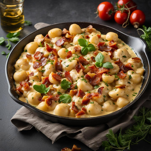 Gönnen Sie sich ein üppiges cremiges Gnocchi-Gericht mit Krabbenfleisch, Speck und einem Hauch von rauchigem Gouda-Käse.