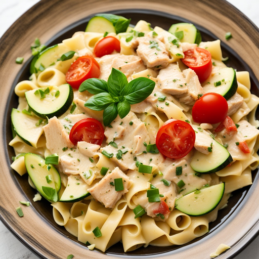 Cremige Hähnchen-Alfredo-Pasta mit einem Hauch Frische von Zucchini und Tomaten