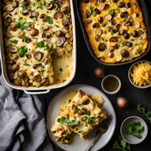 Ein tröstlicher und käsig Kartoffelauflauf mit Zucchini und Pilzen, perfekt für eine herzhafte Mahlzeit.