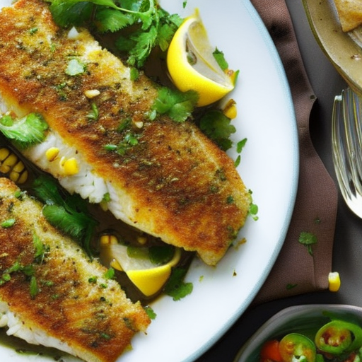 A delicious dish of pan-fried fish fillets with lemon juice, fresh cilantro, corn kernels, and garlic.