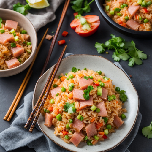 A delicious and savory dish combining tender ham, fluffy rice, and a sweet teriyaki sauce for a satisfying meal.