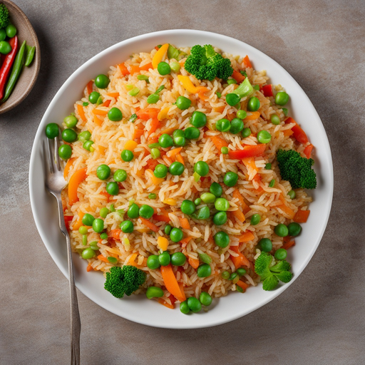 A delicious and colorful dish made with white rice, bell pepper, onion, peas, and carrots.
