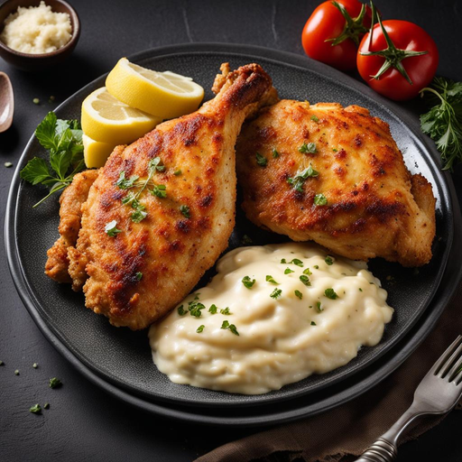 A classic American comfort food dish featuring crispy pan-fried chicken served with creamy mashed potatoes.