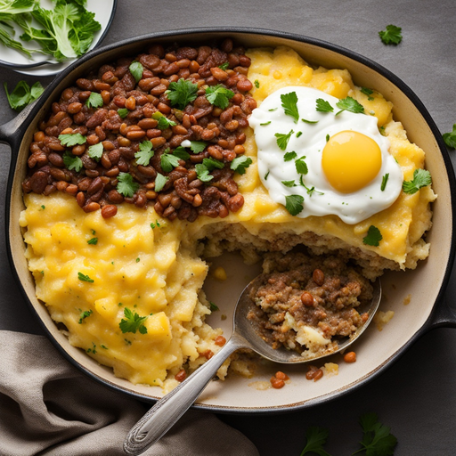 A delicious casserole dish filled with a savory mixture of ground beef, black-eyed peas, and sauerkraut, topped with mashed potatoes and baked to perfection.