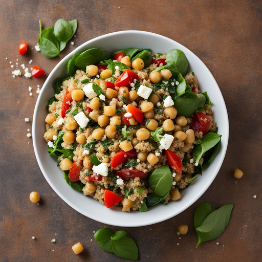 A refreshing and flavorful salad with chickpeas, feta, quinoa, roasted red pepper, artichokes, and baby spinach.