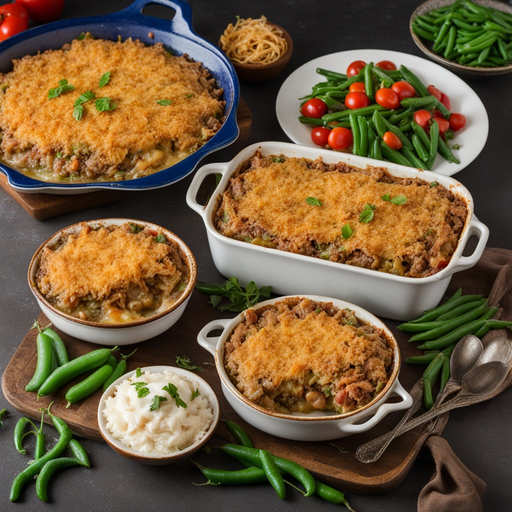 A comforting casserole featuring green beans, creamy sour cream, and flavorful beef gravy, topped with crispy fried onions and melted American cheese.