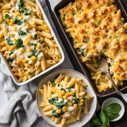 7. 7. In a baking dish, layer the cooked pasta, chicken, spinach, corn, and hamburger.