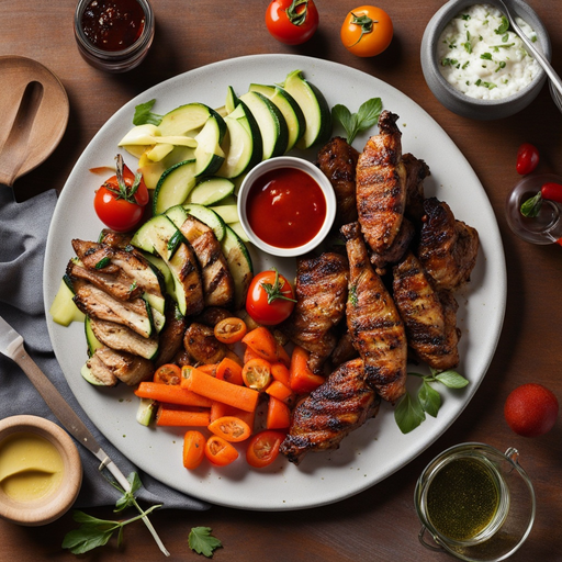 A flavorful and satisfying dish featuring grilled zucchini, chicken wings, and lamb chops with a side of vegetables and fruits