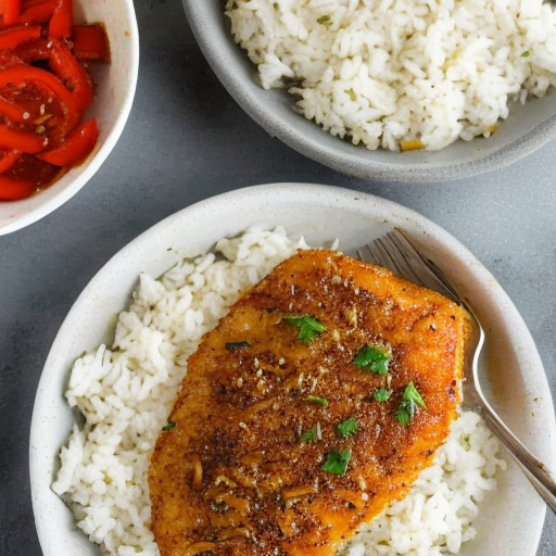 A classic and simple dish of tender boneless chicken breast served with fluffy white rice.