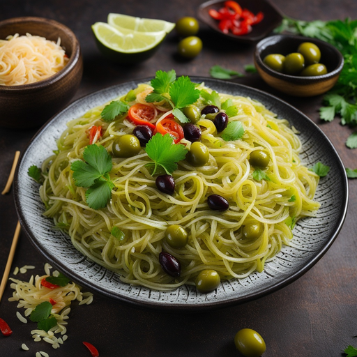 A delicious and flavorful appetizer made with rice vermicelli, green olives, and boiling onions.