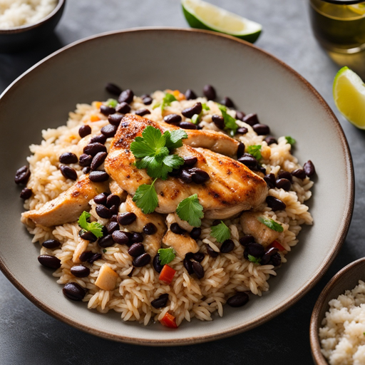 A delicious and creamy dish with tender chicken, black beans, and jasmine rice in a savory sauce.