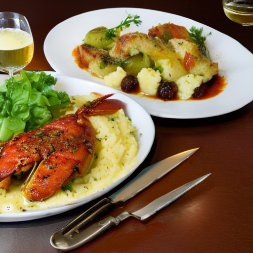 A delicious dish featuring pan-seared lobster, creamy mashed potatoes, and fresh salad.