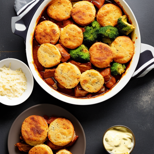 A hearty and flavorful dish featuring tender beef, creamy cheese, and tangy barbecue sauce baked with fluffy biscuits and broccoli florets.