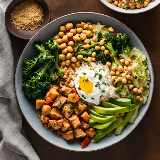 A delicious and nutritious bowl featuring tender chicken, hearty chickpeas, and fresh vegetables, all served over fragrant basmati rice.